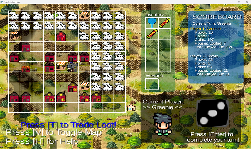 During the second and third phases of the project, I was responsible for minor bug fixes to my pre-existing code, support for other group members using my code, and designing and building the marketing scene from scratch. While a lot of the graphics and images were made by someone else or pulled from the internet, I was responsible for taking the outline and designing the layout for the scene. Many of the features in the market were not required, but I felt it would be beneficial to the player to have them. Many of the extra features included having a custom scoreboard that featured the player's stats, having the player's inventory, and having text turn red when the player wasn't able to purchase something. I felt these added features helped make the game more intuitive and less confusing.